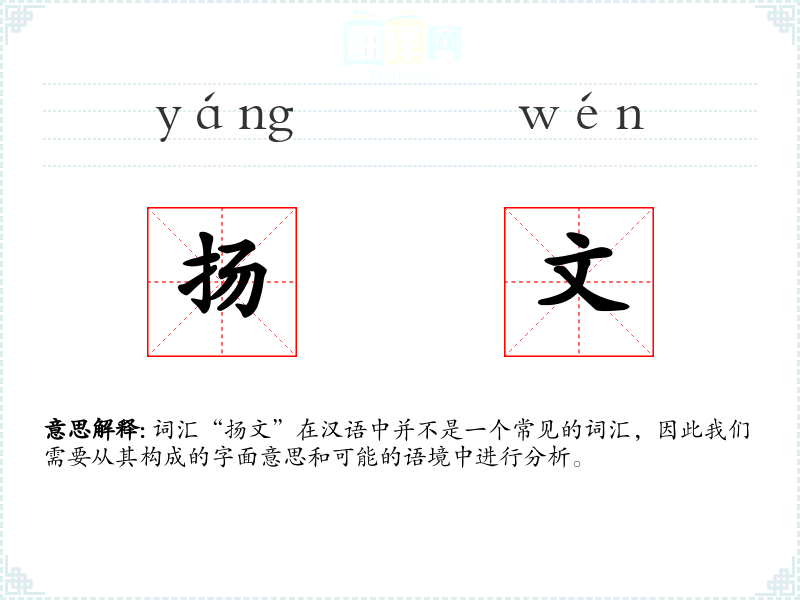 词汇“扬文”在汉语中并不是一个常见的词汇,因此我们需要从其构成的字面意思和可能的语境中进行分析。