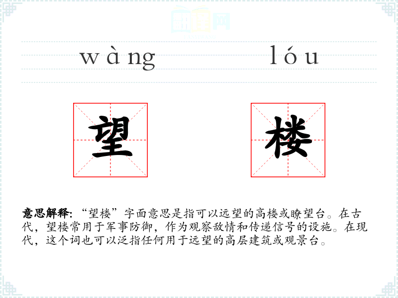“望楼”字面意思是指可以远望的高楼或瞭望台。在古代,望楼常用于军事防御,作为观察敌情和传递信号的设施。在现代,这个词也可以泛指任何用于远望的高层建筑或观景台。