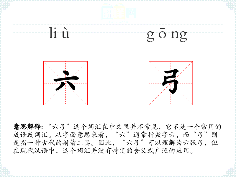 由于“六弓”不是一个常用词汇,它在不同的语境中可能没有特定的使用方式。在古代文献或军事历史中,可能会提到“六弓”作为特定数量的弓箭装备,但在现代文学、口语或专业领域中,这个词汇并不常见。