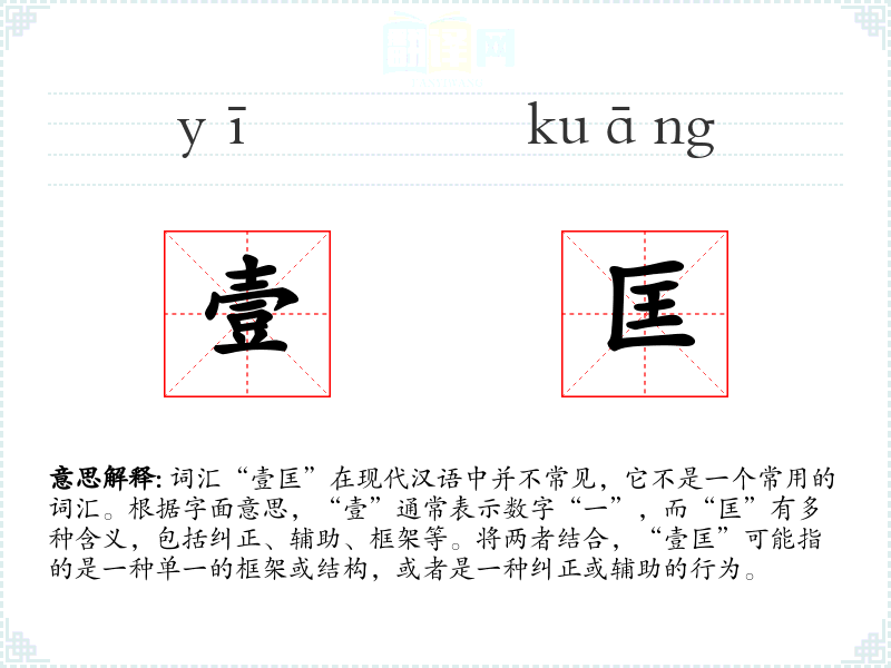 词汇“壹匡”在现代汉语中并不常见,它不是一个常用的词汇。根据字面意思,“壹”通常表示数字“一”,而“匡”有多种含义,包括纠正、辅助、框架等。将两者结合,“壹匡”可能指的是一种单一的框架或结构,或者是一种纠正或辅助的行为。