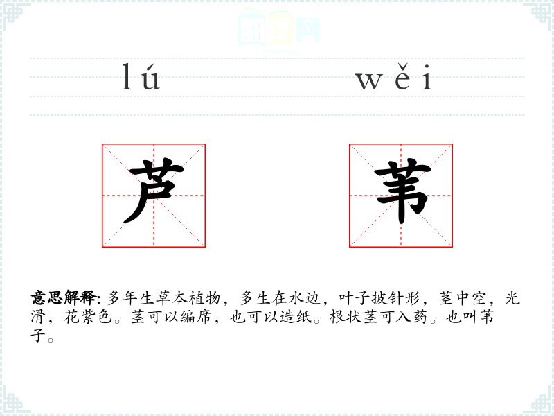 多年生草本植物,多生在水边,叶子披针形,茎中空,光滑,花紫色。茎可以编席,也可以造纸。根状茎可入药。也叫苇子。