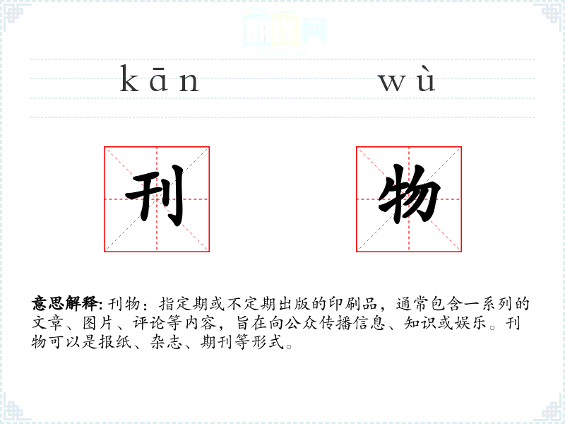 刊物:指定期或不定期出版的印刷品,通常包含一系列的文章、图片、评论等内容,旨在向公众传播信息、知识或娱乐。刊物可以是报纸、杂志、期刊等形式。