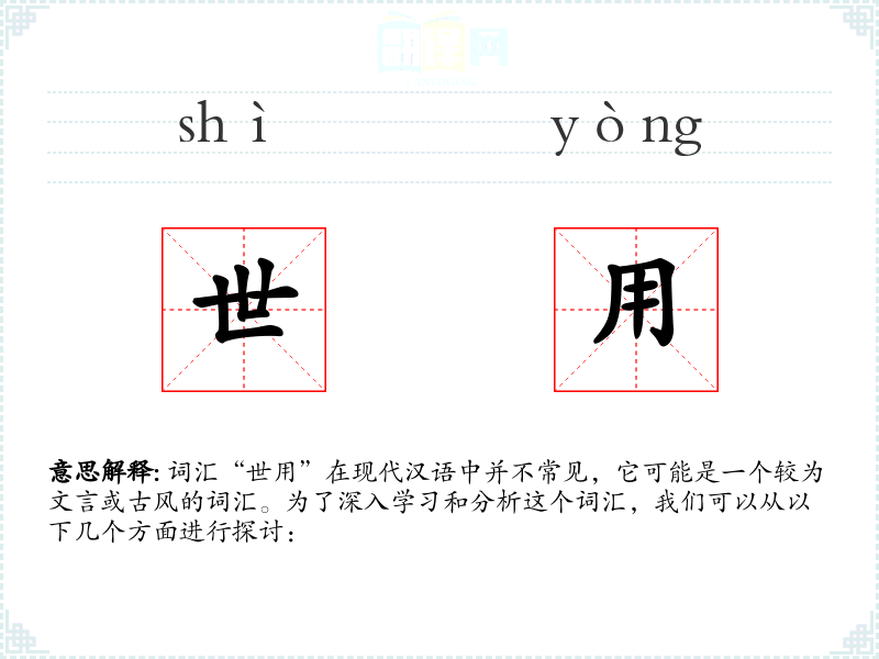 词汇“世用”在现代汉语中并不常见,它可能是一个较为文言或古风的词汇。为了深入学*和分析这个词汇,我们可以从以下几个方面进行探讨: