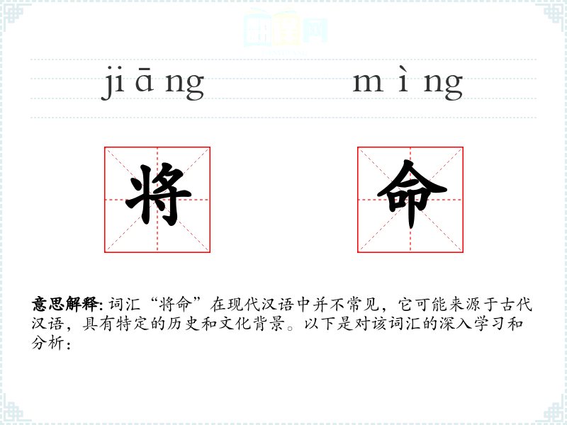 词汇“将命”在现代汉语中并不常见,它可能来源于古代汉语,具有特定的历史和文化背景。以下是对该词汇的深入学*和分析: