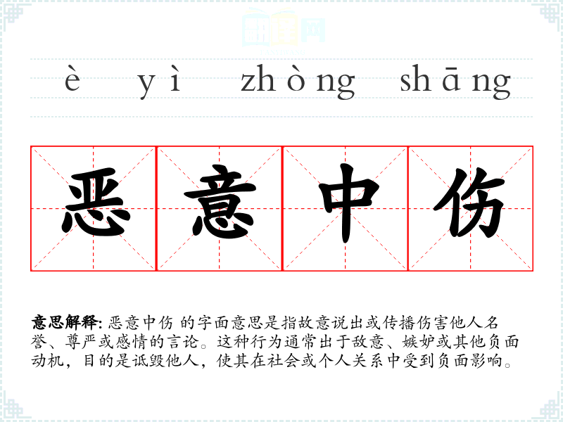 恶意中伤 的字面意思是指故意说出或传播伤害他人名誉、尊严或感情的言论。这种行为通常出于敌意、嫉妒或其他负面动机,目的是诋毁他人,使其在社会或个人关系中受到负面影响。