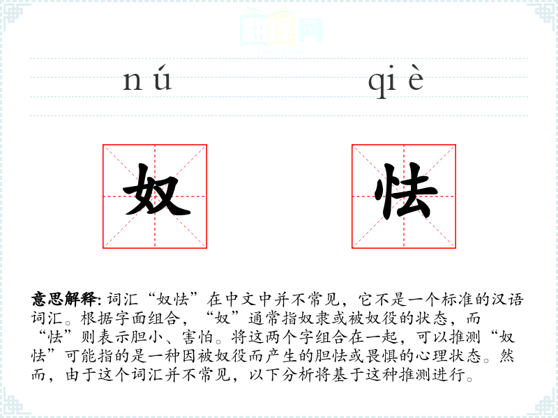 词汇“奴怯”在中文中并不常见,它不是一个标准的汉语词汇。根据字面组合,“奴”通常指奴隶或被奴役的状态,而“怯”则表示胆小、害怕。将这两个字组合在一起,可以推测“奴怯”可能指的是一种因被奴役而产生的胆怯或畏惧的心理状态。然而,由于这个词汇并不常见,以下分析将基于这种推测进行。