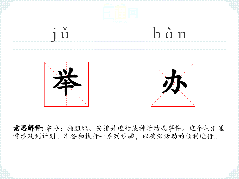 举办:指组织、安排并进行某种活动或**。这个词汇通常涉及到计划、准备和执行一系列步骤,以确保活动的顺利进行。