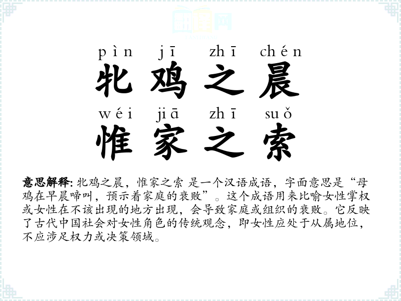 牝鸡之晨,惟家之索 是一个汉语成语,字面意思是“母鸡在早晨啼叫,预示着家庭的衰败”。这个成语用来比喻女性掌权或女性在不该出现的地方出现,会导致家庭或组织的衰败。它反映了古代中国社会对女性角色的传统观念,即女性应处于从属地位,不应涉足权力或决策领域。