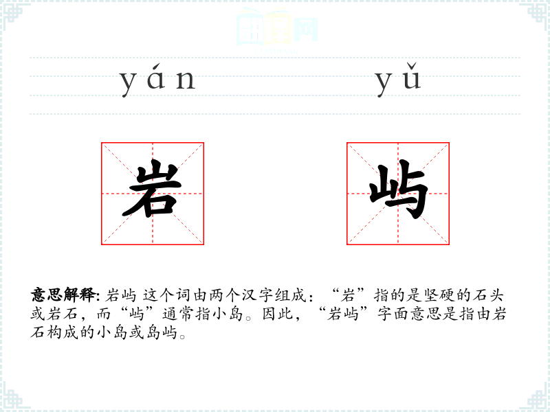 岩屿 这个词由两个汉字组成:“岩”指的是坚硬的石头或岩石,而“屿”通常指小岛。因此,“岩屿”字面意思是指由岩石构成的小岛或岛屿。