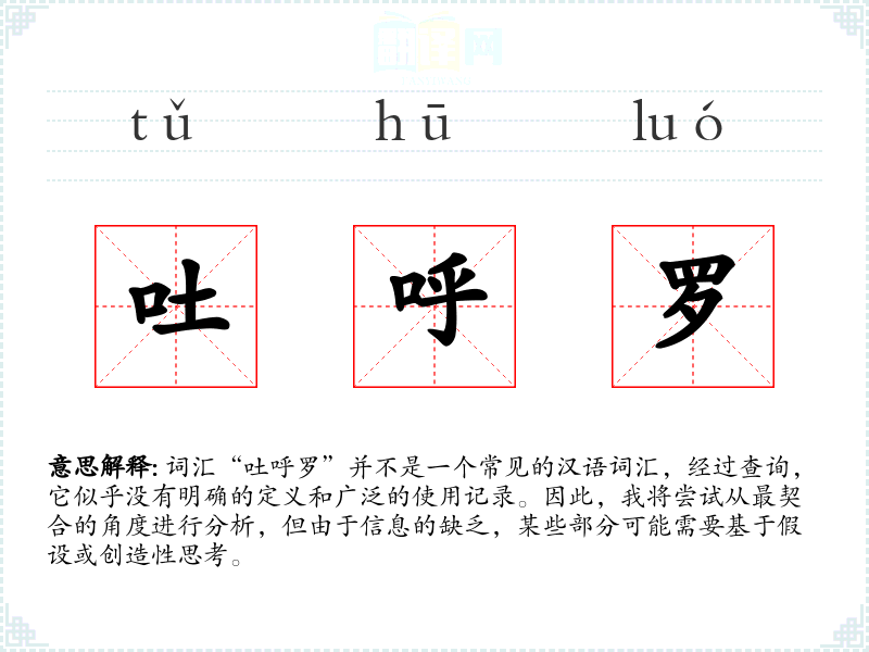 总结来说,由于“吐呼罗”不是一个已知或常见的词汇,我们无法提供详细的分析。如果这是一个特定语境下的词汇,建议进一步的研究和探索。