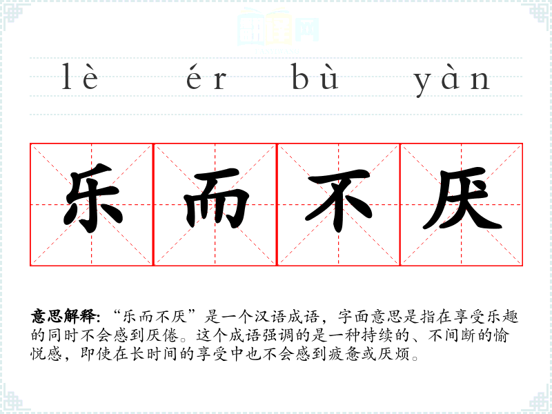 “乐而不厌”是一个汉语成语,字面意思是指在享受乐趣的同时不会感到厌倦。这个成语强调的是一种持续的、不间断的愉悦感,即使在长时间的享受中也不会感到疲惫或厌烦。