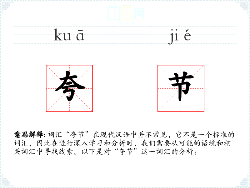词汇“夸节”在现代汉语中并不常见,它不是一个标准的词汇,因此在进行深入学习和分析时,我们需要从可能的语境和相关词汇中寻找线索。以下是对“夸节”这一词汇的分析: