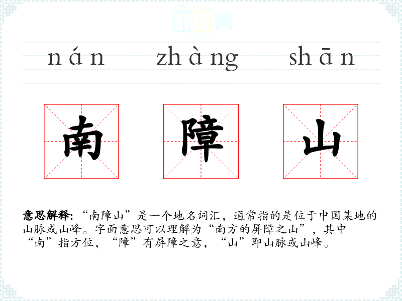 “南障山”是一个地名词汇,通常指的是位于**某地的山脉或山峰。字面意思可以理解为“南方的屏障之山”,其中“南”指方位,“障”有屏障之意,“山”即山脉或山峰。