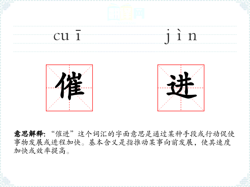 “催进”这个词汇的字面意思是通过某种手段或行动促使事物发展或进程加快。基本含义是指推动某事向前发展,使其速度加快或效率提高。