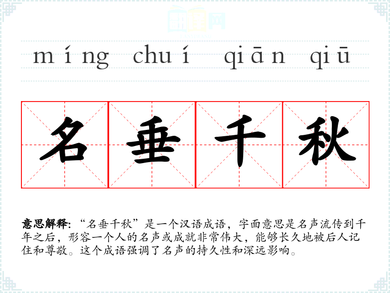 “名垂千秋”是一个汉语成语,字面意思是名声流传到千年之后,形容一个人的名声或成就非常伟大,能够长久地被后人记住和尊敬。这个成语强调了名声的持久性和深远影响。