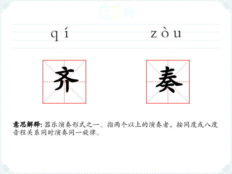 器乐演奏形式之一。指两个以上的演奏者,按同度或八度音程关系同时演奏同一旋律。