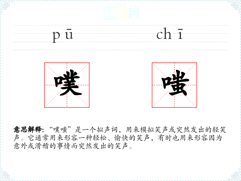 - 反义词:无,因为“噗嗤”主要用于描述笑声,没有直接的反义词。