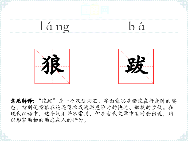 - 在古代诗词中,“狼跋”常用来形容狼的动态,如“狼跋其胡,载疐其尾”(《诗经·小雅·狼跋》)。