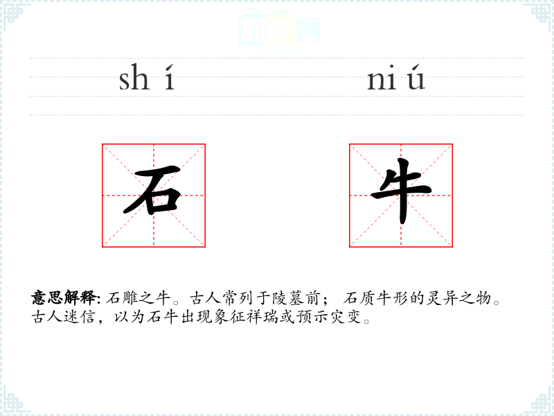 石雕之牛。古人常列于陵墓前; 石质牛形的灵异之物。古人迷信,以为石牛出现象征祥瑞或预示灾变。