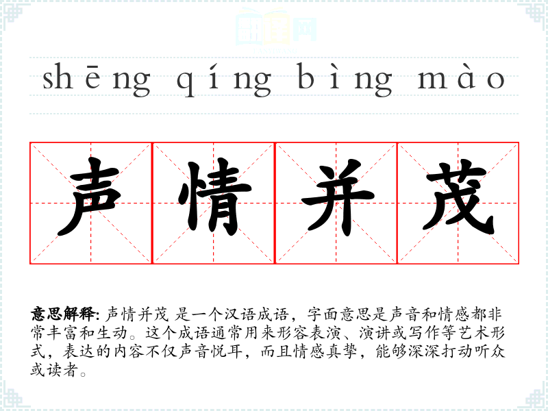声情并茂 是一个汉语成语,字面意思是声音和情感都非常丰富和生动。这个成语通常用来形容表演、演讲或写作等艺术形式,表达的内容不仅声音悦耳,而且情感真挚,能够深深打动听众或读者。