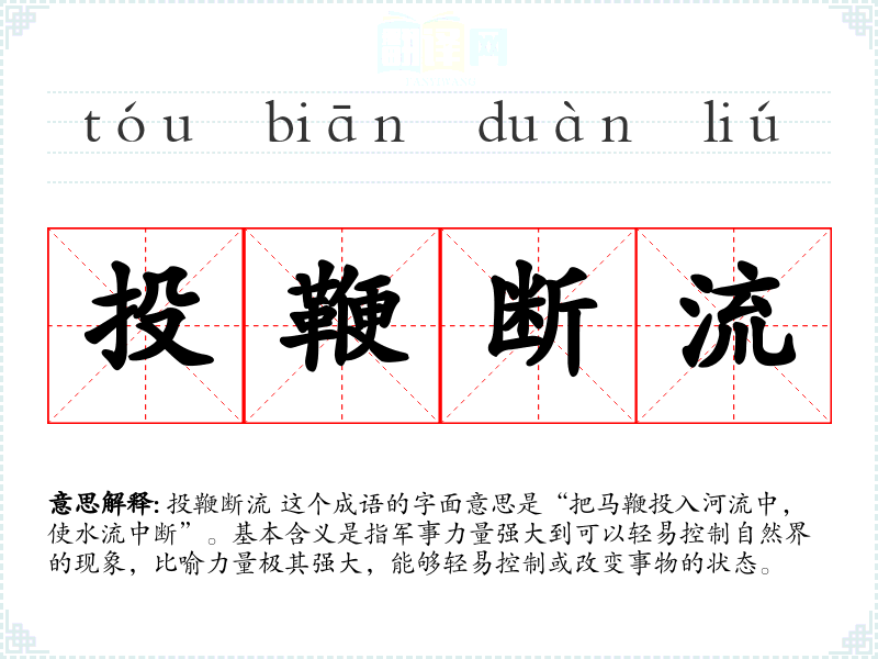 投鞭断流 这个成语的字面意思是“把马鞭投入河流中,使水流中断”。基本含义是指军事力量强大到可以轻易控制自然界的现象,比喻力量极其强大,能够轻易控制或改变事物的状态。