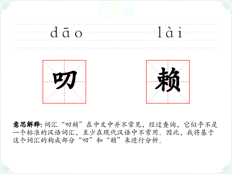 尽管“叨赖”不是一个常用词汇,通过对其构成部分“叨”和“赖”的分析,我们可以理解它可能表达的意思。在语言学习和表达中,了解词汇的构成和可能的含义有助于我们更好地理解和使用语言。