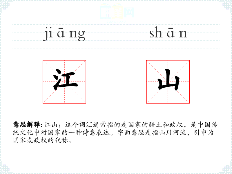- 反义词:无(因为“江山”是一个比较抽象和诗意的词汇,通常不直接有反义词)