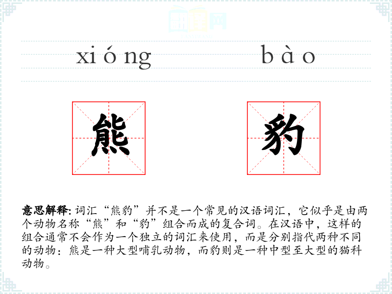 词汇“熊豹”并不是一个常见的汉语词汇,它似乎是由两个动物名称“熊”和“豹”组合而成的复合词。在汉语中,这样的组合通常不会作为一个独立的词汇来使用,而是分别指代两种不同的动物:熊是一种大型哺乳动物,而豹则是一种中型至大型的猫科动物。