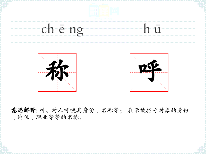 叫。对人呼唤其身份﹑名称等; 表示被招呼对象的身份﹑地位﹑职业等等的名称。