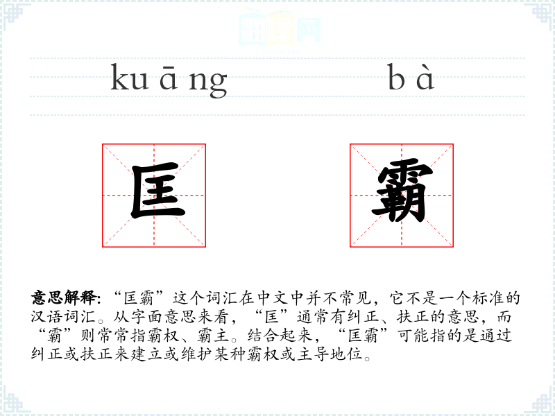 在特定的文化或社会背景中,“匡霸”可能被用来形容那些通过正义或道德手段来建立或维护其统治地位的人物或势力。这种用法强调了正义和道德在权力结构中的重要性。