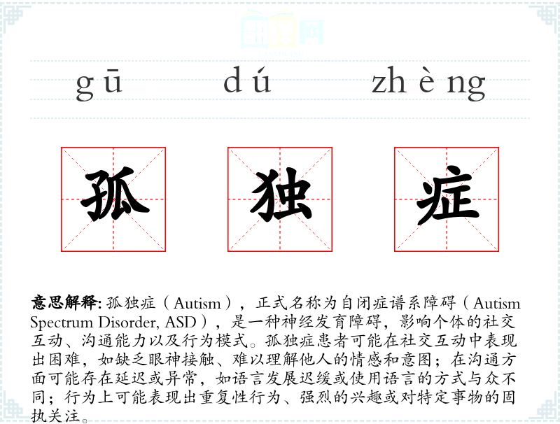 "孤独症"的意思解释、孤独症是什么意思由翻译网汉语词典查词提供。