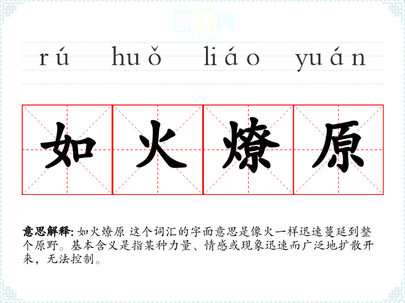 如火燎原 这个词汇的字面意思是像火一样迅速蔓延到整个原野。基本含义是指某种力量、情感或现象迅速而广泛地扩散开来,无法控制。