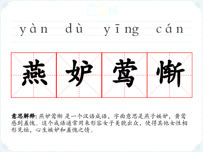 燕妒莺惭 是一个汉语成语,字面意思是燕子嫉妒,黄莺感到羞愧。这个成语通常用来形容女子美貌出众,使得其他女性相形见绌,心生嫉妒和羞愧之情。