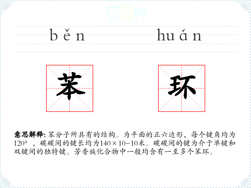 苯分子所具有的结构。为平面的正六边形,每个键角均为120°,碳碳间的键长均为140×10-10米。碳碳间的键为介于单键和双键间的独特键。芳香族化合物中一般均含有一至多个苯环。