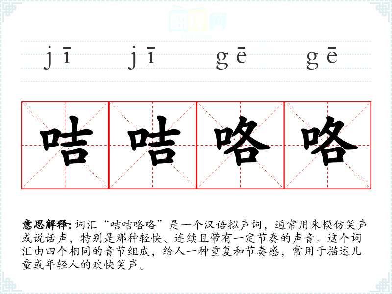 “咭咭咯咯”字面意思是一种模仿声音的词汇,主要用来形容笑声或说话声的轻快、连续和有节奏的特点。
