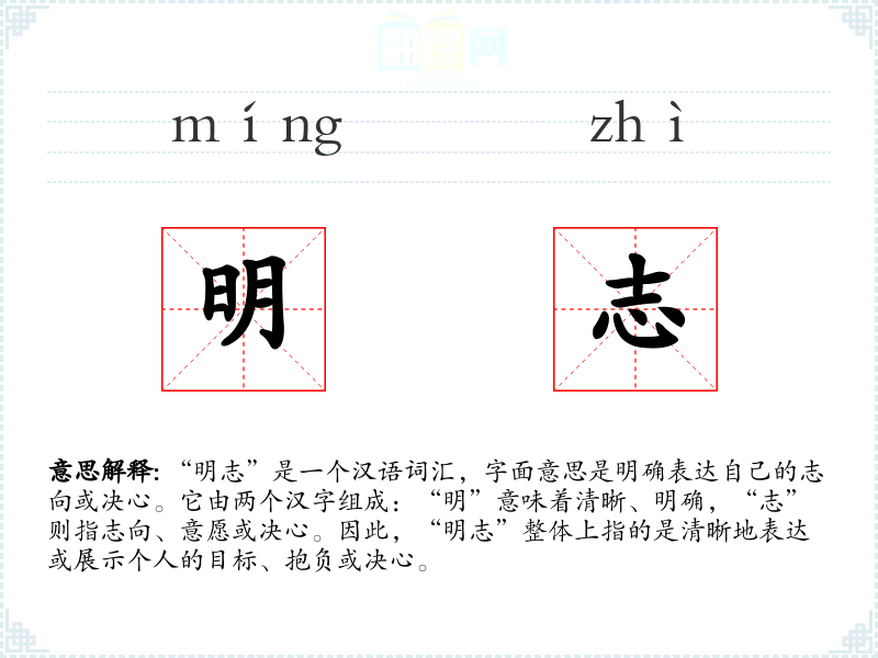 “明志”是一个汉语词汇,字面意思是明确表达自己的志向或决心。它由两个汉字组成:“明”意味着清晰、明确,“志”则指志向、意愿或决心。因此,“明志”整体上指的是清晰地表达或展示个人的目标、抱负或决心。