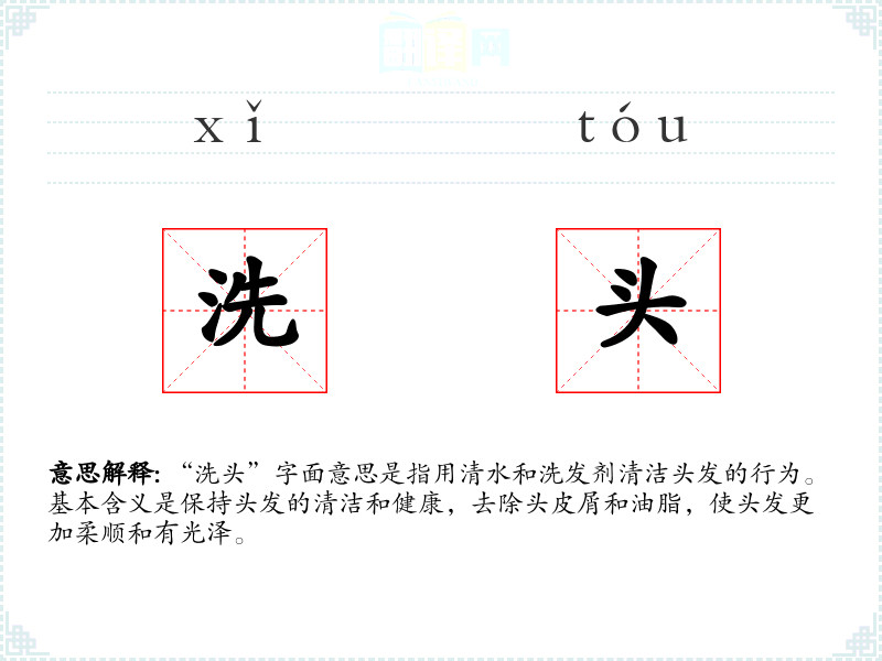 “洗头”字面意思是指用清水和洗发剂清洁头发的行为。基本含义是保持头发的清洁和健康,去除头皮屑和油脂,使头发更加柔顺和有光泽。