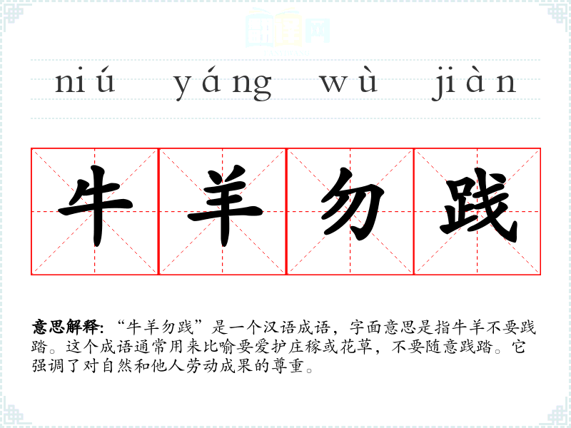 - 在公园里,管理员常常会挂上“牛羊勿践”的牌子,提醒游客不要践踏花草。