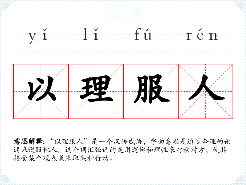 “以理服人”是一个汉语成语,字面意思是通过合理的论述来说服他人。这个词汇强调的是用逻辑和理性来打动对方,使其接受某个观点或采取某种行动。