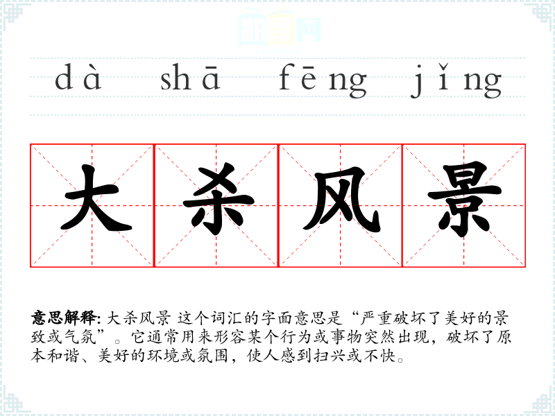 大杀风景 这个词汇的字面意思是“严重破坏了美好的景致或气氛”。它通常用来形容某个行为或事物突然出现,破坏了原本和谐、美好的环境或氛围,使人感到扫兴或不快。