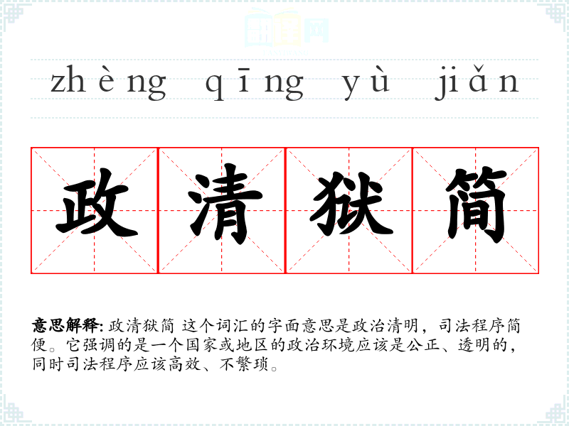 政清狱简 这个词汇的字面意思是政治清明,司法程序简便。它强调的是一个国家或地区的政治环境应该是公正、透明的,同时司法程序应该高效、不繁琐。