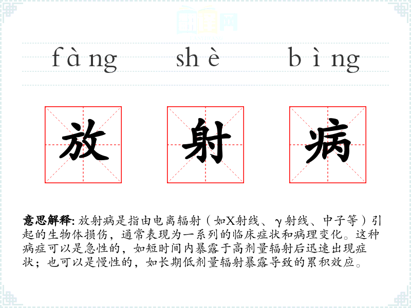 - 同义词:辐射损伤、辐射病、辐射中毒