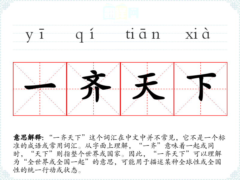“一齐天下”这个词汇在中文中并不常见,它不是一个标准的成语或常用词汇。从字面上理解,“一齐”意味着一起或同时,“天下”则指整个世界或国家。因此,“一齐天下”可以理解为“全世界或全国一起”的意思,可能用于描述某种全球性或全国性的统一行动或状态。