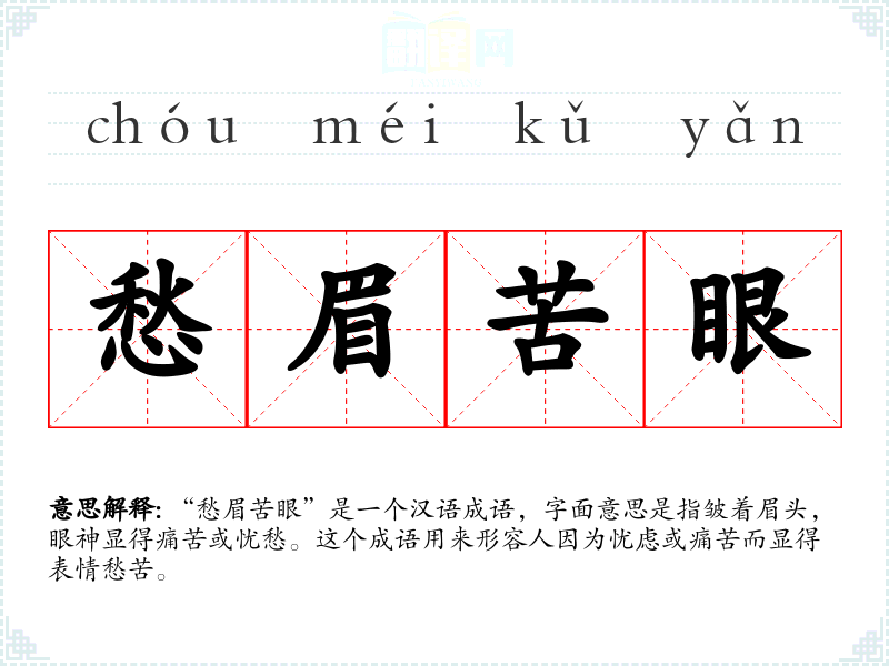 “愁眉苦眼”是一个汉语成语,字面意思是指皱着眉头,眼神显得痛苦或忧愁。这个成语用来形容人因为忧虑或痛苦而显得表情愁苦。