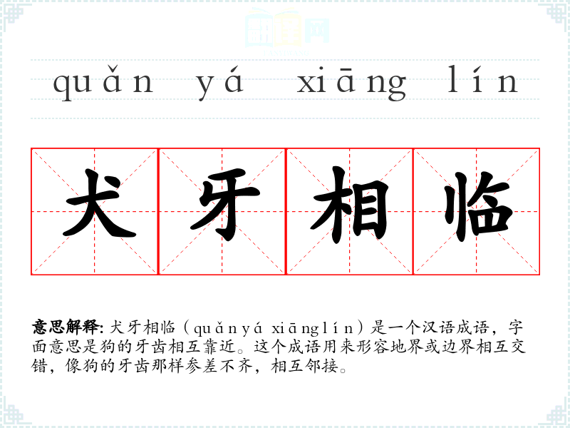犬牙相临(quǎn yá xiāng lín)是一个汉语成语,字面意思是狗的牙齿相互靠近。这个成语用来形容地界或边界相互交错,像狗的牙齿那样参差不齐,相互邻接。