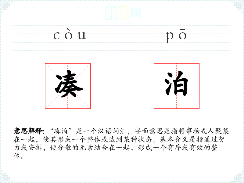 “凑泊”是一个汉语词汇,字面意思是指将事物或人聚集在一起,使其形成一个整体或达到某种状态。基本含义是指通过努力或安排,使分散的元素结合在一起,形成一个有序或有效的整体。