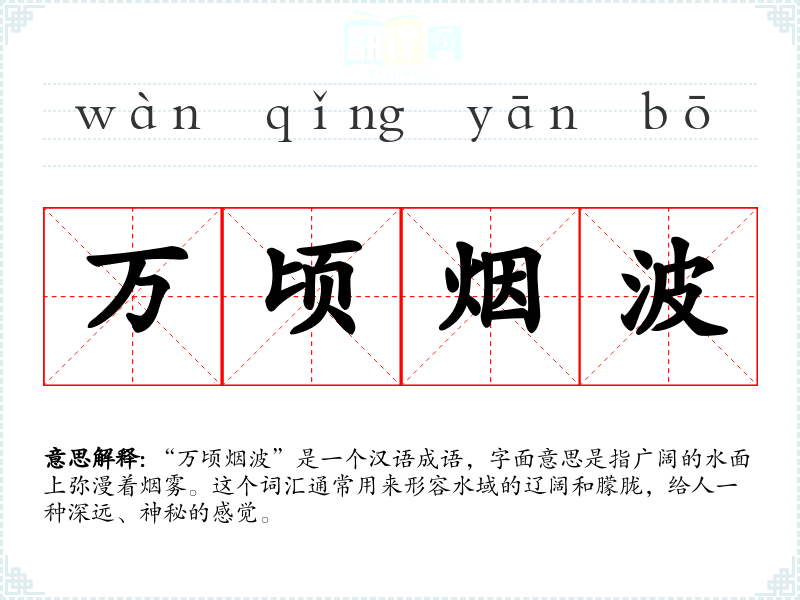 “万顷烟波”是一个汉语成语,字面意思是指广阔的水面上弥漫着烟雾。这个词汇通常用来形容水域的辽阔和朦胧,给人一种深远、神秘的感觉。