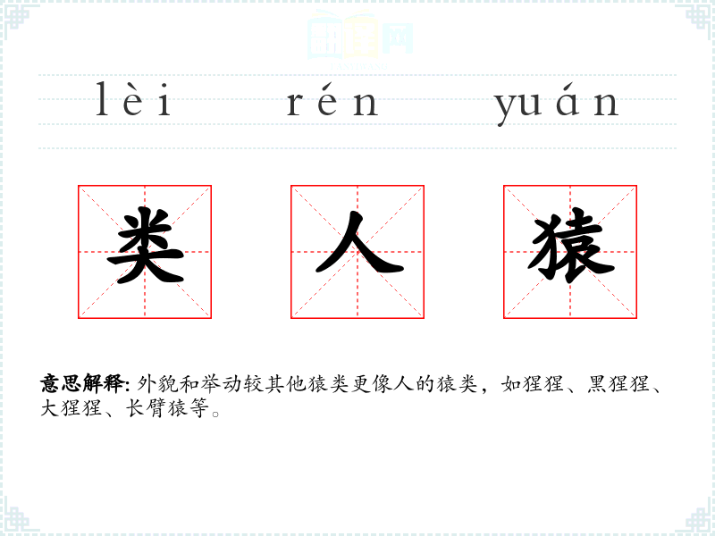 外貌和举动较其他猿类更像人的猿类,如猩猩、黑猩猩、大猩猩、长臂猿等。