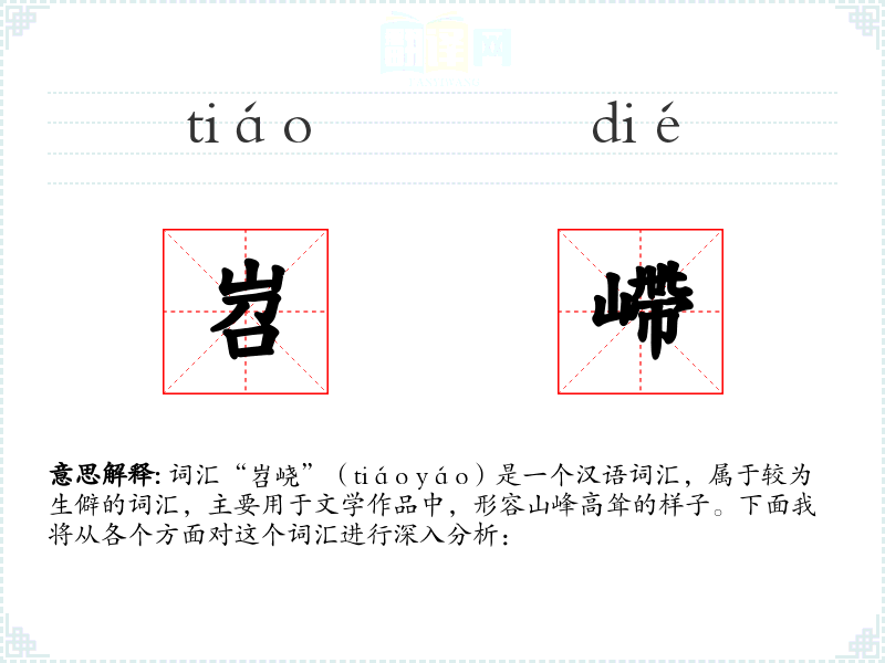 词汇“岧峣”(tiáo yáo)是一个汉语词汇,属于较为生僻的词汇,主要用于文学作品中,形容山峰高耸的样子。下面我将从各个方面对这个词汇进行深入分析: