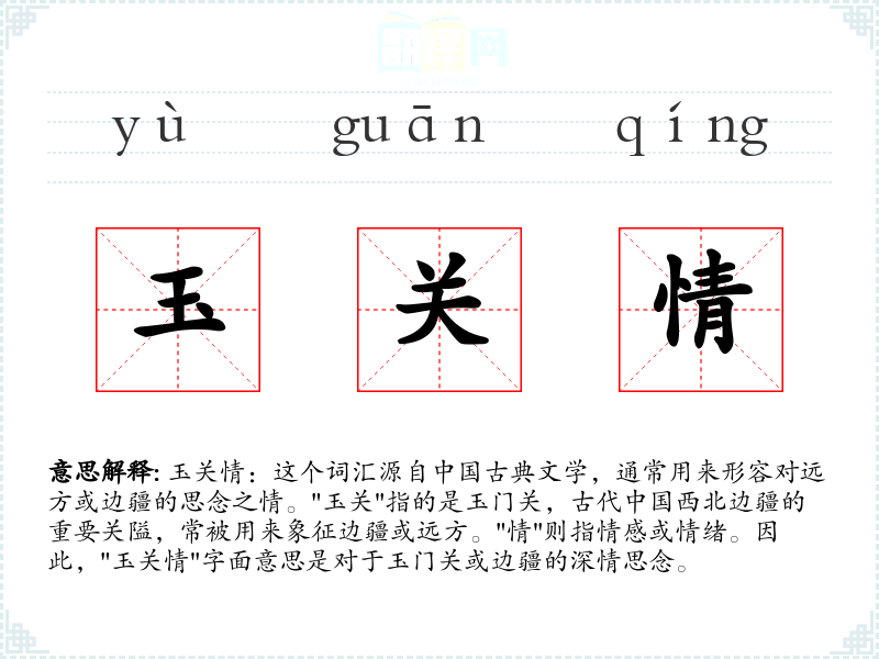 玉关情:这个词汇源自古典文学,通常用来形容对远方或边疆的思念之情。"玉关"指的是玉门关,古代西北边疆的重要关隘,常被用来象征边疆或远方。"情"则指情感或情绪。因此,"玉关情"字面意思是对于玉门关或边疆的深情思念。